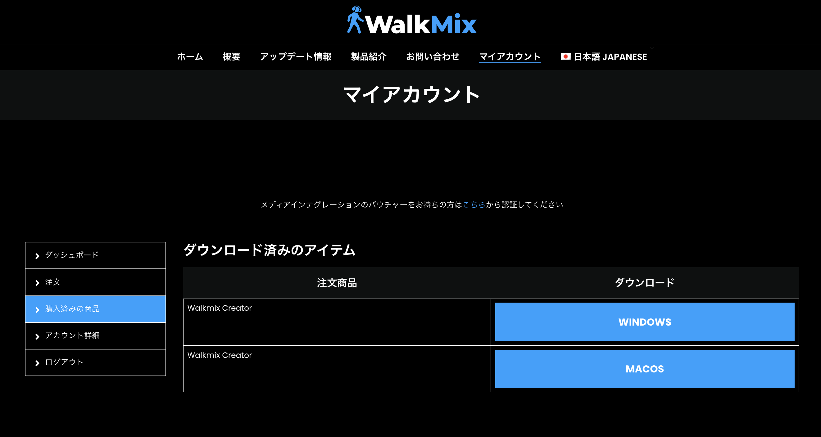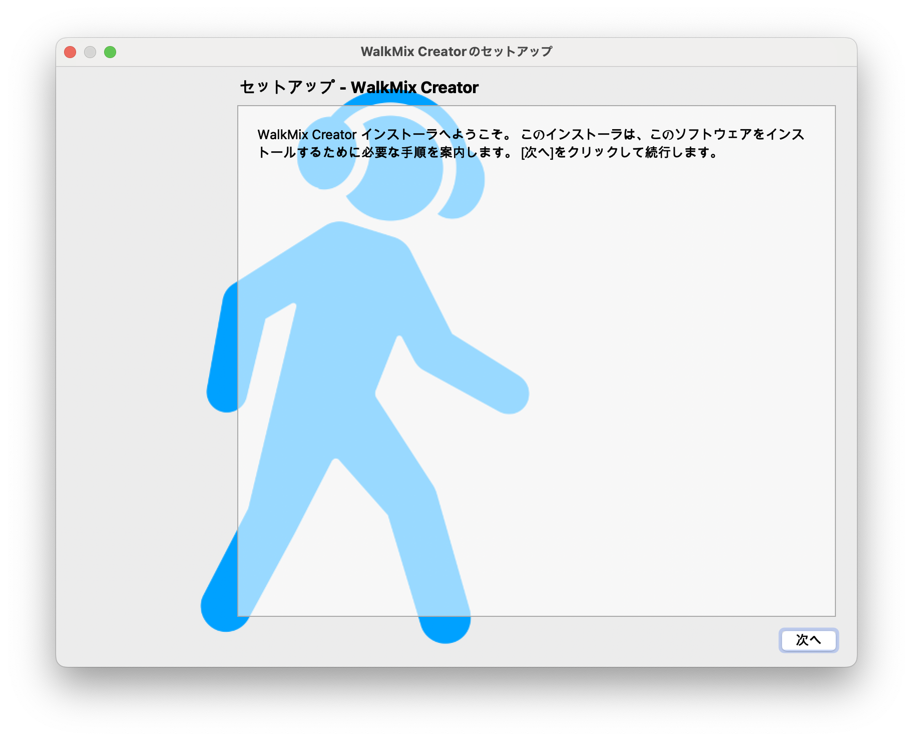 Mac:WalkMix Creator.dmg(ダブルクリックし、イメージファイルを開いたら表示されている”WalkMix Creator”インストーラーを起動します)