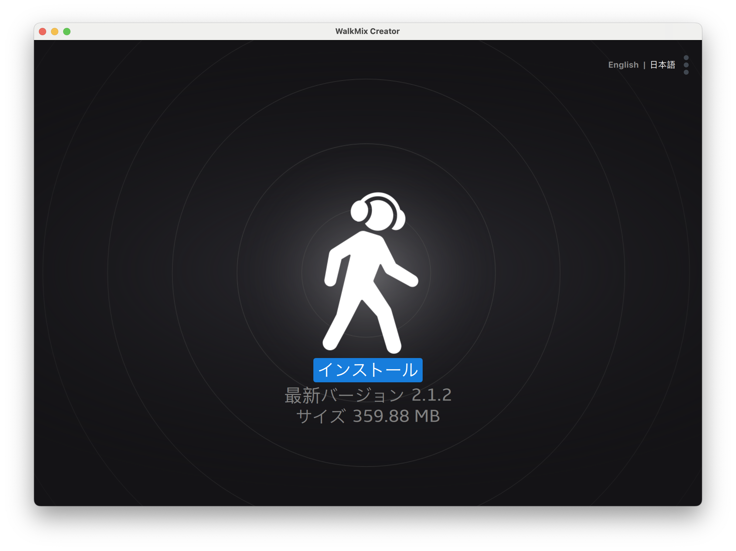 5. インストールが完了しましたら、WalkMix Creatorのアプリケーションが自動的に起動しますので、「インストール」のボタンをクリックしてWalkMix Creatorのプラグインをインストールします。