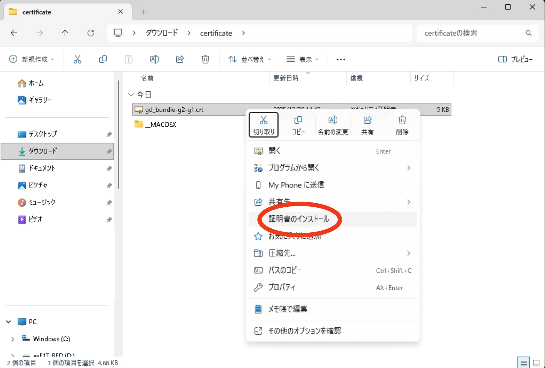 3. 展開したフォルダの中にある「gd_bundle-g2-g1.crt」を右クリックし、「証明書のインストール」をクリックして、画面の指示に従ってインストールを完了します。