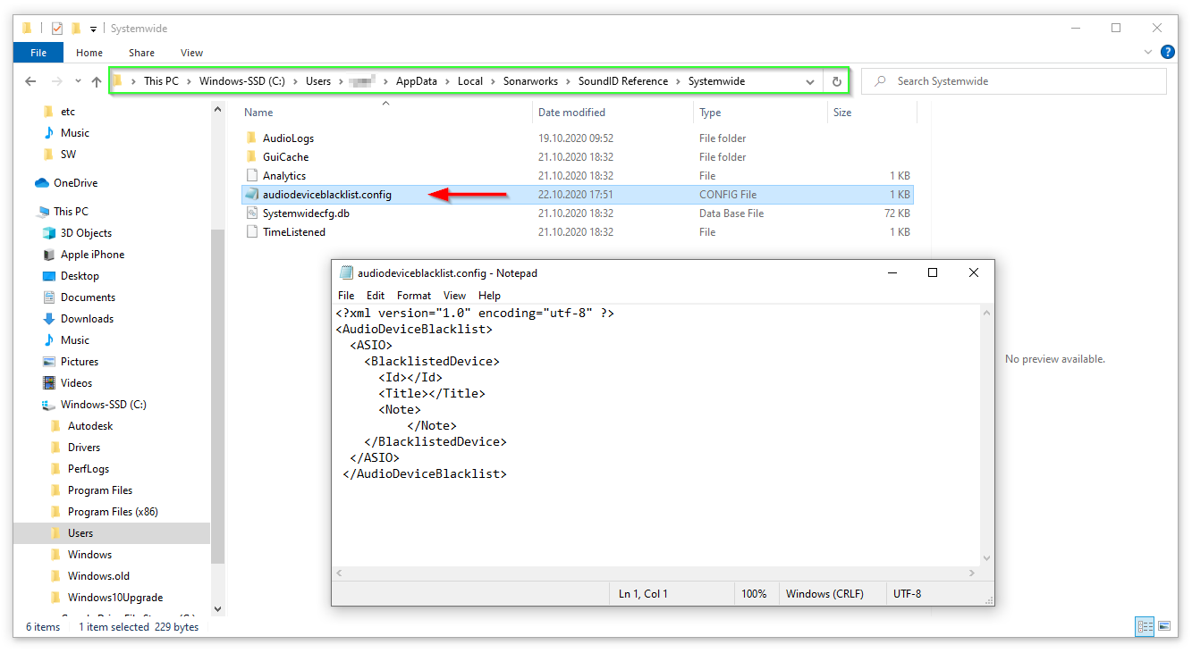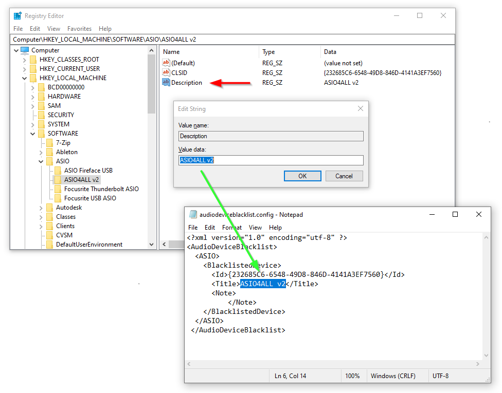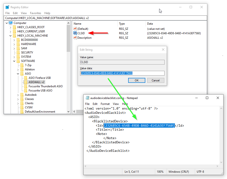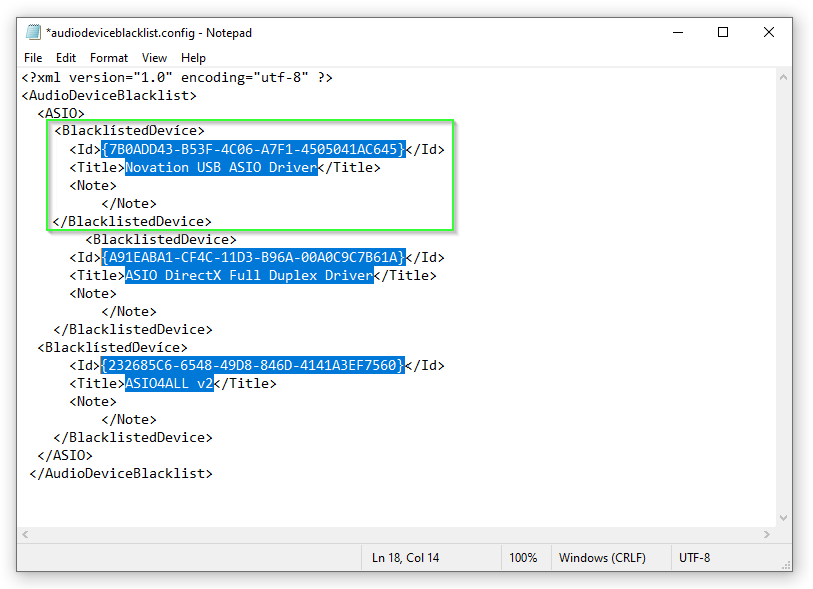 10. 複数の ASIO ドライバーをブラックリストに登録する場合は、audiodeviceblacklist.configファイルの <BlacklistedDevice> セクション全体を必要な分だけコピーし、レジストリ エディターから適切なドライバーの詳細を ID およびタイトル フィールドに入力してください。