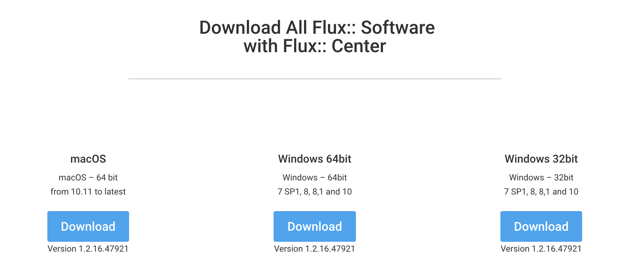 以下のFlux::社のページより"Flux:: Center"をダウンロードしてください。Mac/Windowsのご利用のOSを選択してダウンロードします。
