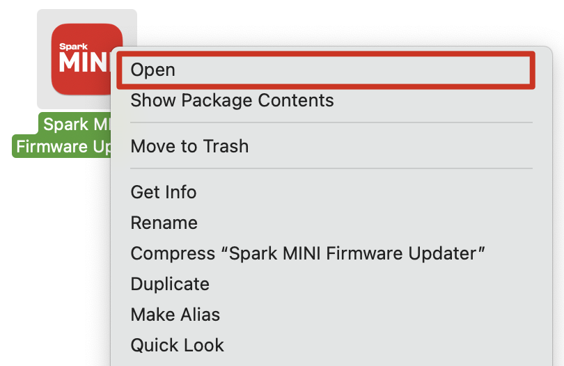 PositiveGrid社ページよりダウンロードしたファームウェアアップデータ/インストーラファイルを右クリック(またはControlキーを押しながらクリック)し、ドロップダウンメニューから「開く」を選択してください。
