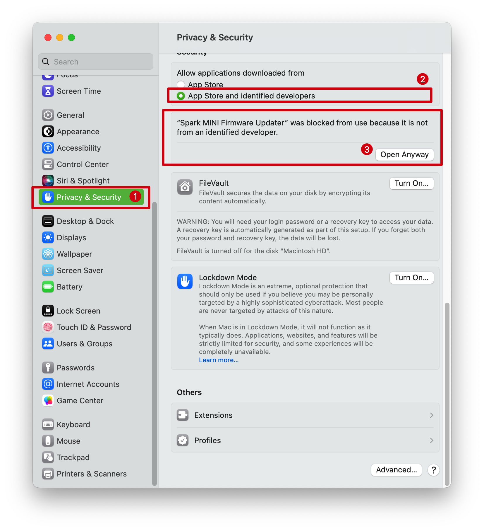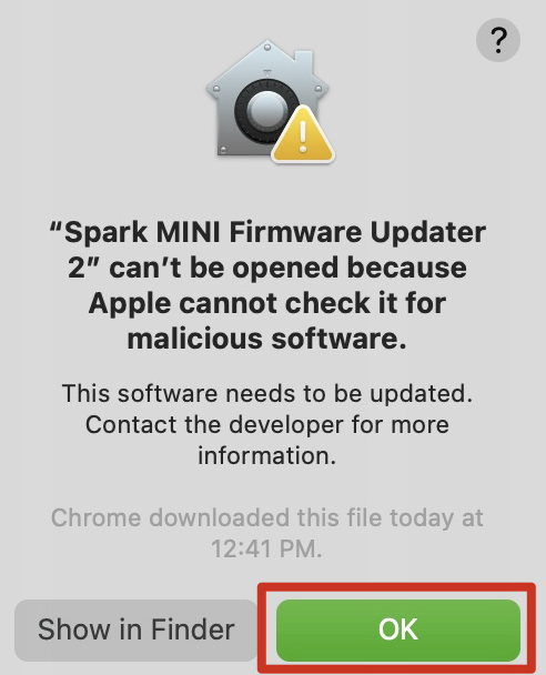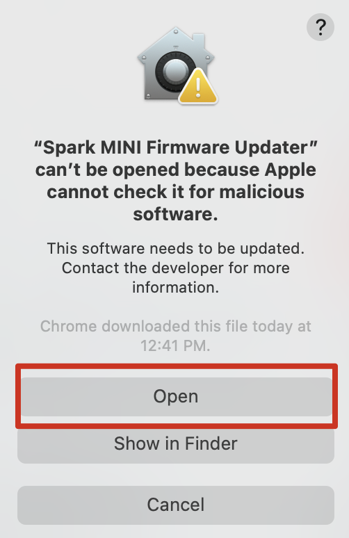 macOS環境にて SparkシリーズのファームウェアアップデータやBIASシリーズインストーラを開こうとした際、セキュリティ警告が表示される場合があります。