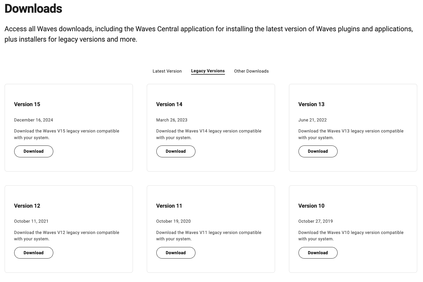 ご利用のOSが最新のWavesバージョンでサポートされないなど、以前のバージョンのOSをご利用の際は、下記ページをご参考に対応のWaves Centralをダウンロード、インストールしてください。