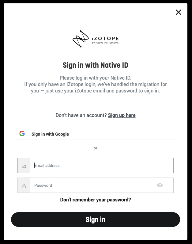 起動すると以下のような画面が表示されます。 既にNative IDをお持ちの場合はアカウントのメールアドレスとパスワードを入力してログインしてください。まだNative IDをお持ちでない場合は、「Sign up here」をクリックしてアカウントを作成ください。