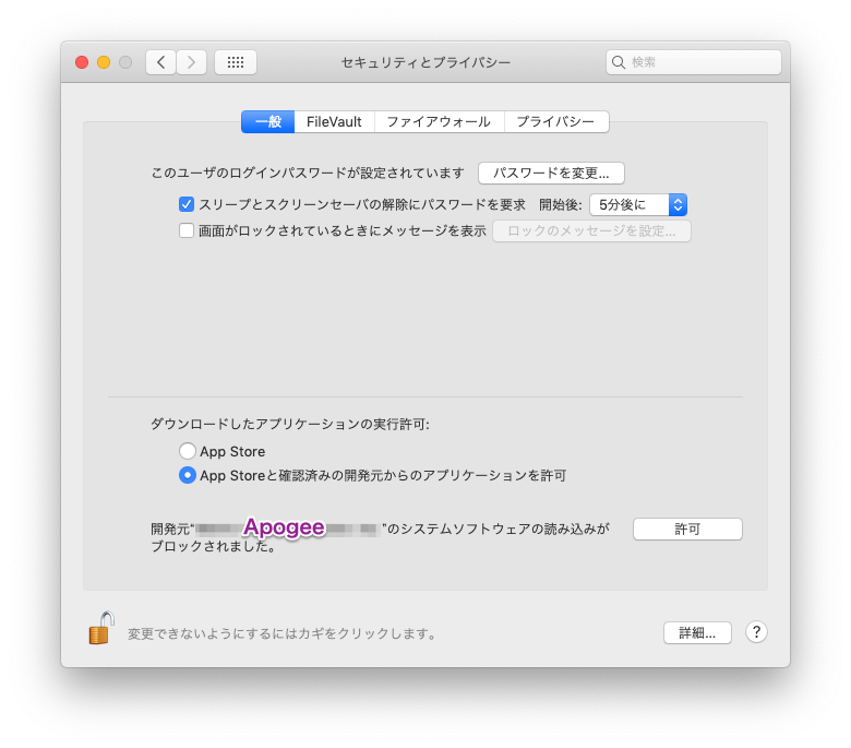 4. システム環境設定[セキュリティとプライバシー]パネルを開き、"一般"タブより[許可]ボタンが表示されているかを確認します。(既に開いている場合は、ボタンを閉じてから再度開いてボタンを表示する必要があります)