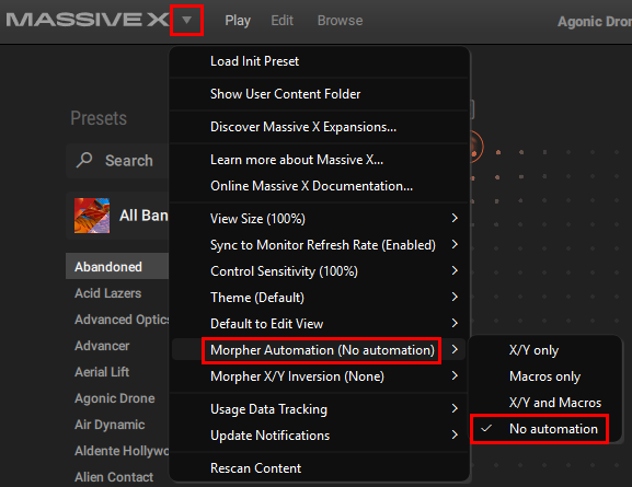 これにより、Morpher Automation 設定を複数の中から切り替えることが可能になります。「No automation」を選択すると、アレンジ作業や詳細な編集を行っている間、ホスト DAW へのオートメーションイベントの送信を防ぐことができます。ミックスの録音を行う際には、必要に応じてオートメーション設定を再度有効にしてください。
