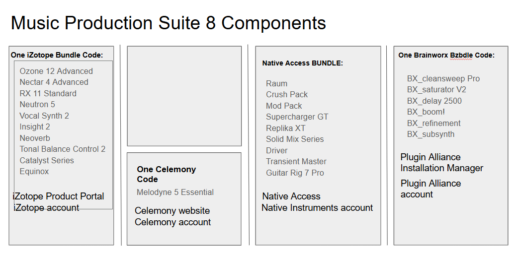 iZotope Music Production Suite Bundleには、iZotope、Plugin Alliance / Brainworx、Native Instruments、Celemonyの製品が含まれています。
