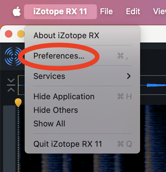 1. RXを起動し、画面左上のiZotope RX〇〇 から「Preferences」をクリックします。