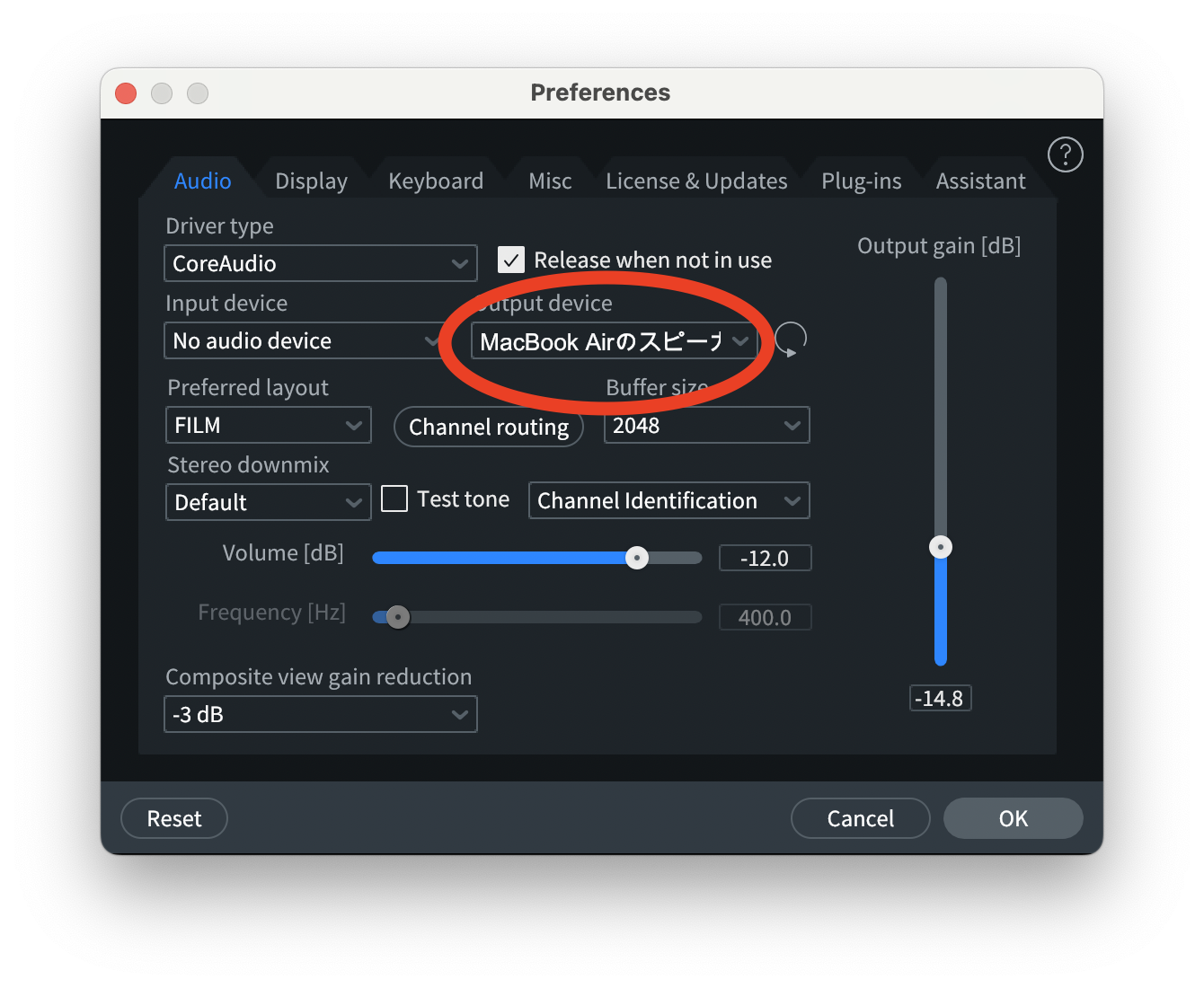 2. Preferences画面が表示されますので、こちらのAudioのタブにてOutput Deviceの項目が「No audio device」と表示されている場合は、クリックしてご使用のオーディオデバイスを設定してください。