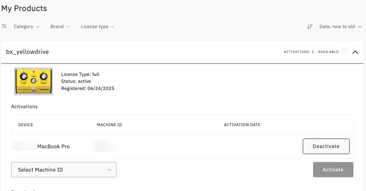 2.表示される製品リストで確認、ディアクティベートする製品をクリックします。
