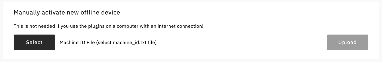 6. Manage Devicesページ>[ Manually activate new offline device ] セクションにて、Selectをクリックして先のステップで保存した”machine_id.txt”ファイルを選択、Uploadボタンでアップロードします。[ Activate ] をクリックします。