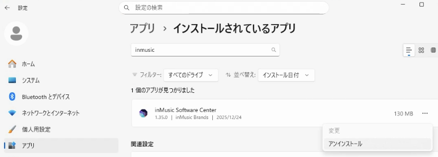 Windowsの設定>アプリ>インストールされているアプリから、BFD3ソフトウェアおよびinMusic Software Centerをアンインストールします。