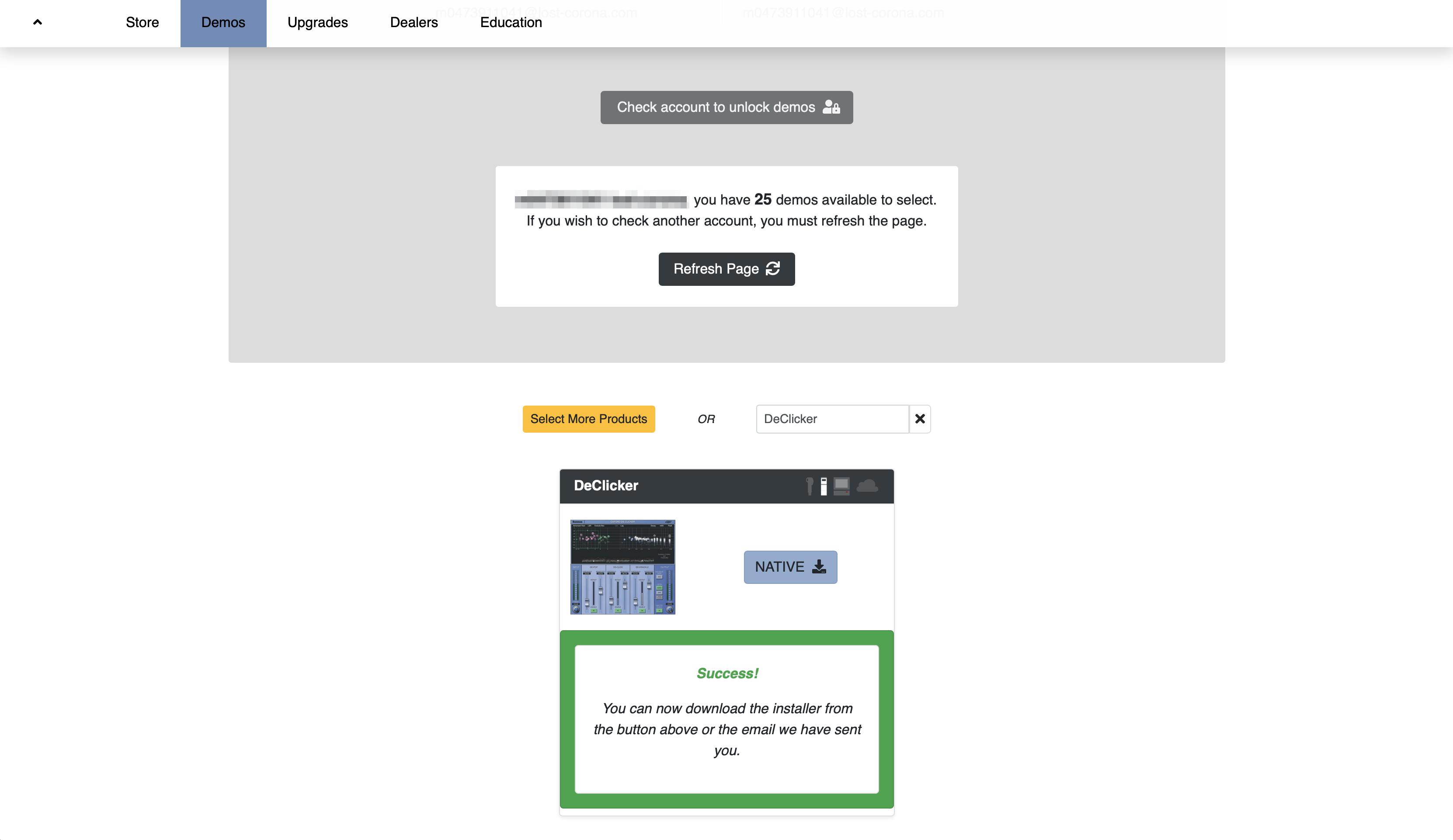 Sonnox 15 Day Demo Selector画面にてiLok.com IDおよび登録Eメールを入力し、"Check account to unlock demo"をクリックします。