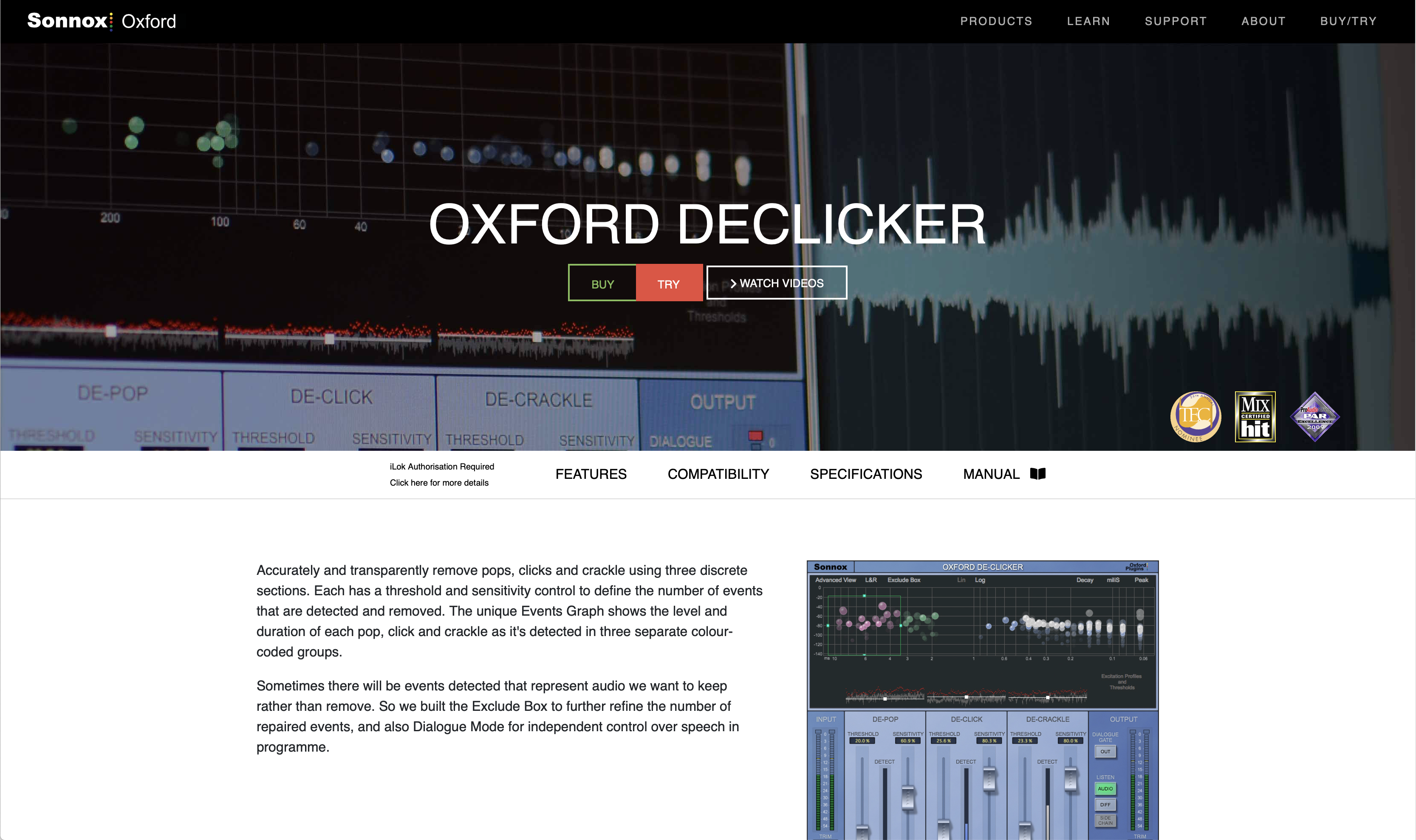 デモライセンスを希望するSonnox製品ページにアクセスし、TRYボタンをクリックします。