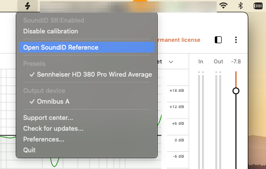 MacのメニューバーにSoundID Referenceアイコンが表示される場合は、メニューからQuitを選択し、スタンドアローンアプリケーションを終了した状態で再度プラグインの動作をご確認ください。
