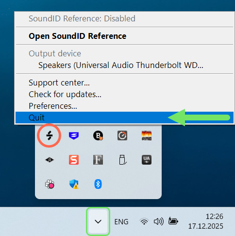 タスクバーのSoundID Referenceアイコンを右クリック>Quitを選択してアプリを完全に終了し、再起動します。