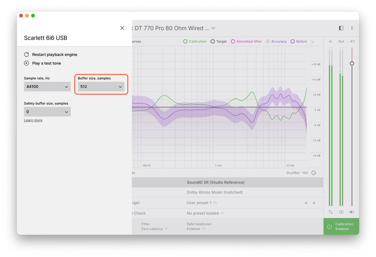 SoundID Referenceアプリケーション > Output Panel > 「…」> Device settings > Buffer size, samplesにて、異なるサンプルレートとバッファサイズをお試しください。