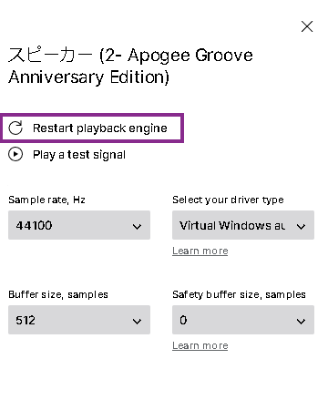 SoundID Referenceアプリケーション > Output Panel > 「…」> Device settings > Restart playback engine を選択してエンジンを再起動します。