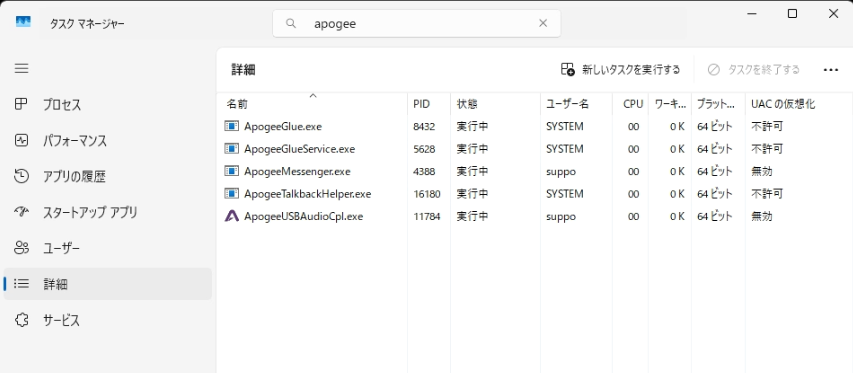 Apogee Glue は終了させると自動的に再起動するため、まずはプロセスを終了させてください。