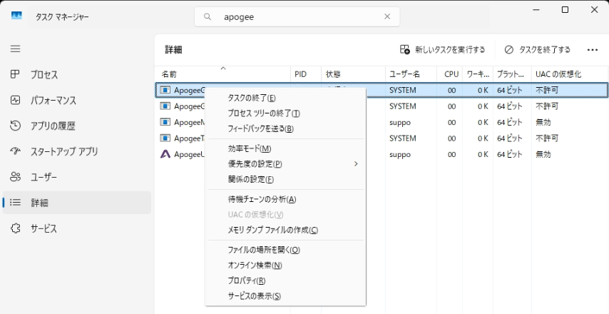 c. "ApogeeGlue.exe"を右クリックし、"タスクの終了"をクリックします。