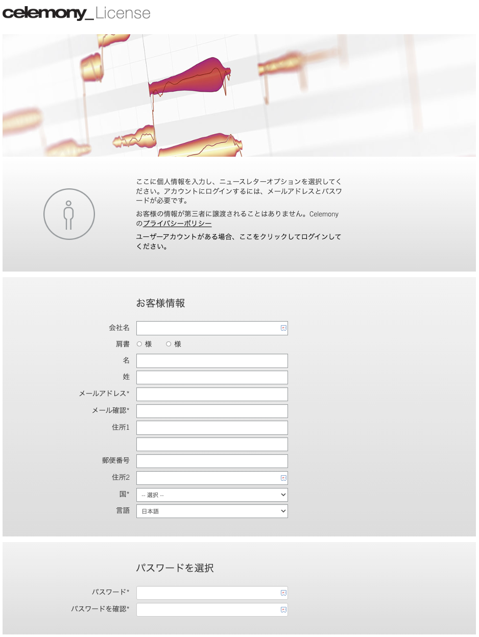アカウント作成画面が表示されます。お客様情報の項目とパスワードを入力して画面下の保存をクリックしてアカウントを作成します。