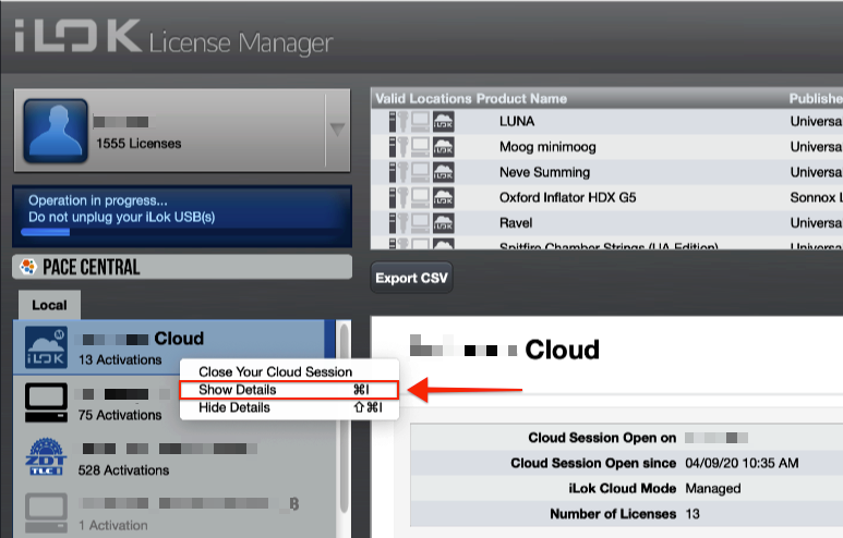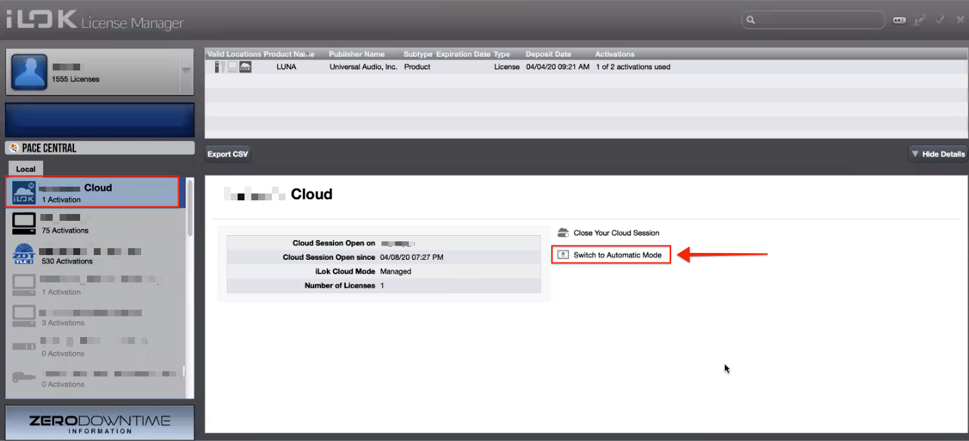 管理モードでは、ライセンスをiLok Cloudセッションに対して手動でアクティブ化する必要があります。