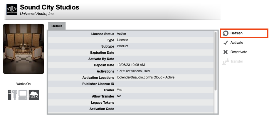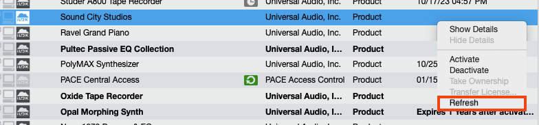 - [Refresh] を選択します。別の方法は、ライセンスをダブルクリックして詳細パネルを開くことです。次に、iLokライセンスマネージャーの右側から、[Refresh]をクリックします。