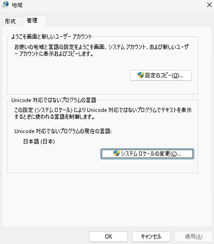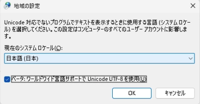 「ベータ: ワールドワイド言語サポートで Unicode UTF-8 を使用」にチェックを入れ、OKを押します。