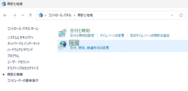コントロールパネルの一覧から、時計と地域 > 地域 を開きます。