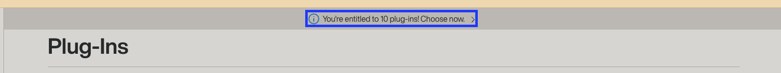 登録完了後、アカウント内のPlug-Insページに進みます。「You're entitled to [数字] plug-ins! Choose now.>」をクリックし、表示される一覧から、ご登録バンドルに沿った数の製品をお選びください。