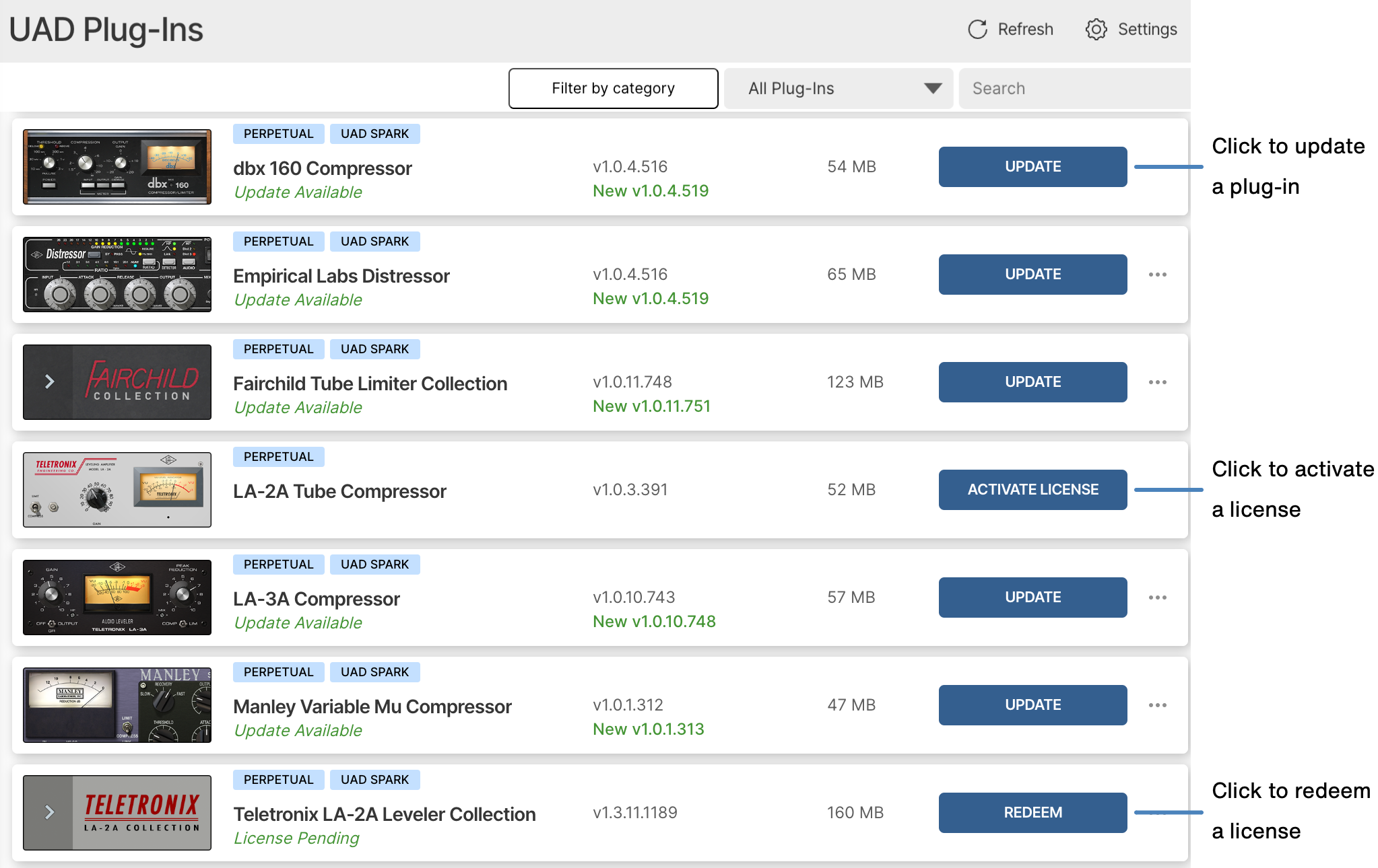 アカウントでのプラグイン選択を完了後、UA Connectを起動し、「Refresh」をクリックします。続いてUAD Plug-Insタブを開きます。新しいプラグインがタブ内に表示されることをご確認ください。